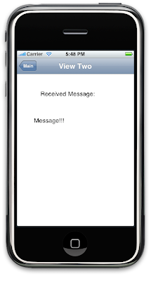 As you can see the setMessage: method sends a notification to the notification center. We will add an observer to View Two so it is notified when a different message is set. The retain method is called by getMessage to help the object "retain" the value of this variable. If this method is not called the application may not function correctly. (You can try removing this line of code and sending a lot of messages when the application is finished if you want to see the effects of this.)